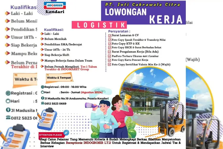 Dikutip dari laman @indogrosir_kendari pada Sabtu (10/8/2024), berikut ini persyaratan rekrutmen tenaga kerja untuk posisi Logistik.