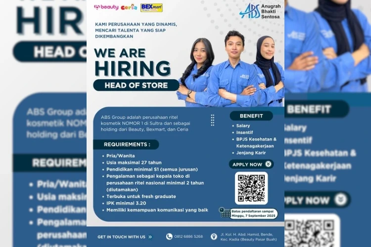 Seperti dikutip dari laman Instagram @absgroup.kdi pada Rabu (3/9/2025), ABS Group mencari talenta yang siap dikembangkan menjadi seorang Head of Store.