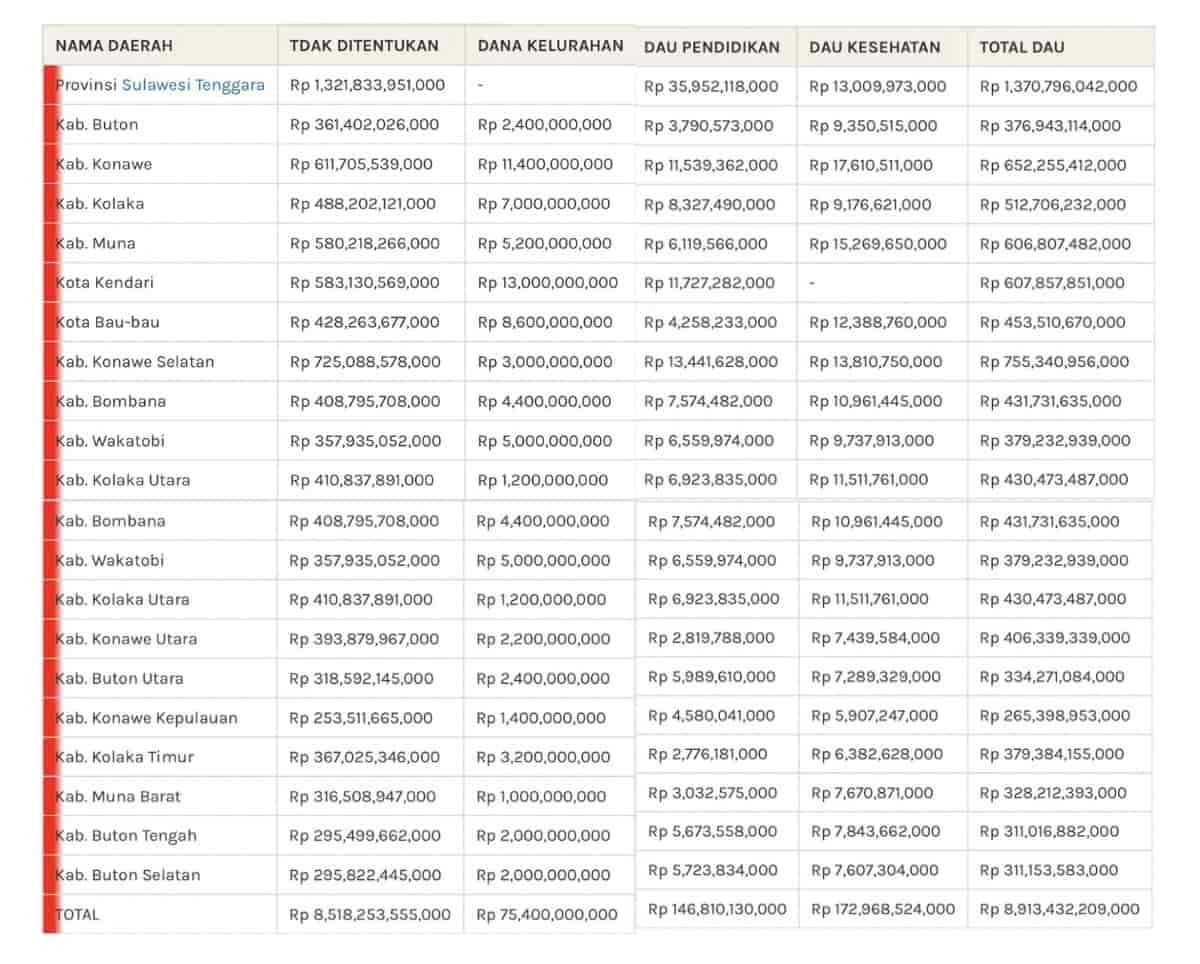 Berbeda pada tahun 2025, pemerintah pusat mengalokasikan DAU di Sultra sebesar Rp 10 triliun.