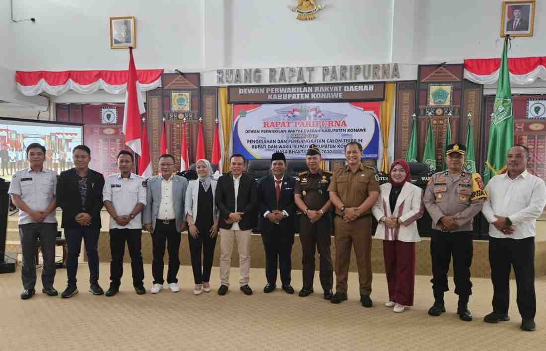 KONAWE – Dewan Perwakilan Rakyat Daerah (DPRD) Kabupaten Konawe menggelar Rapat Paripurna untuk pengesahan dan pengangkatan calon kepala daerah, Bupati dan Wakil Bupati terpilih periode 2025-2030, Yusran Akbar dan Syamsul Ibrahim pada Senin, 13 Januari 2025.