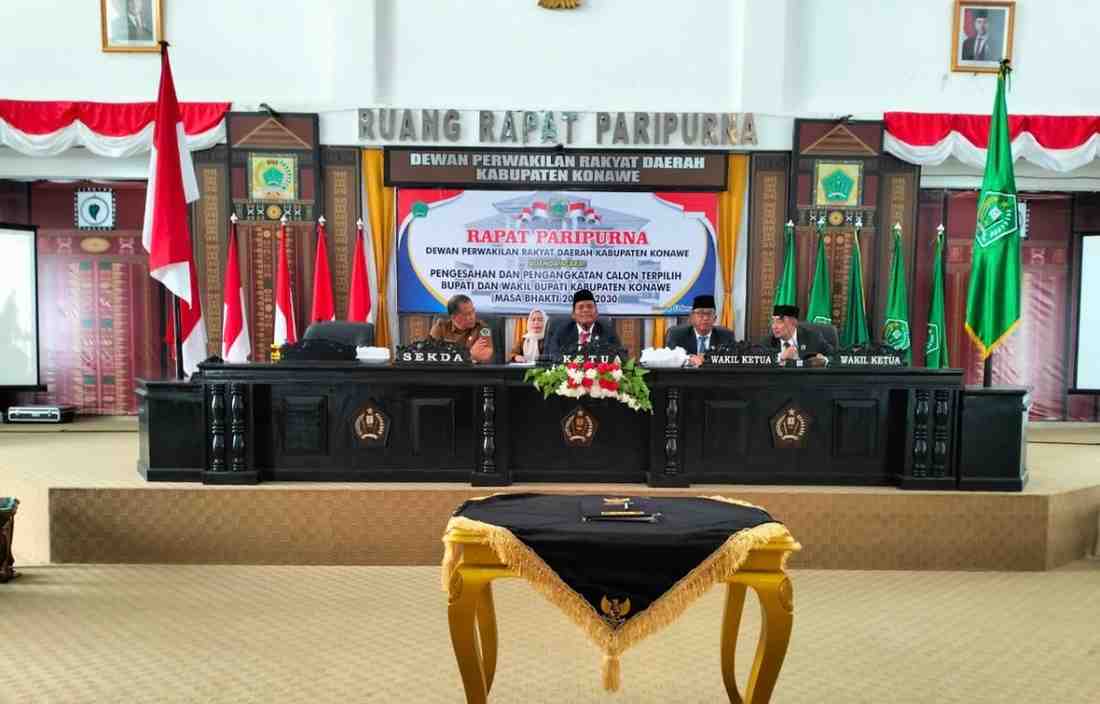 KONAWE – Dewan Perwakilan Rakyat Daerah (DPRD) Kabupaten Konawe menggelar Rapat Paripurna untuk pengesahan dan pengangkatan calon kepala daerah, Bupati dan Wakil Bupati terpilih periode 2025-2030, Yusran Akbar dan Syamsul Ibrahim pada Senin, 13 Januari 2025.