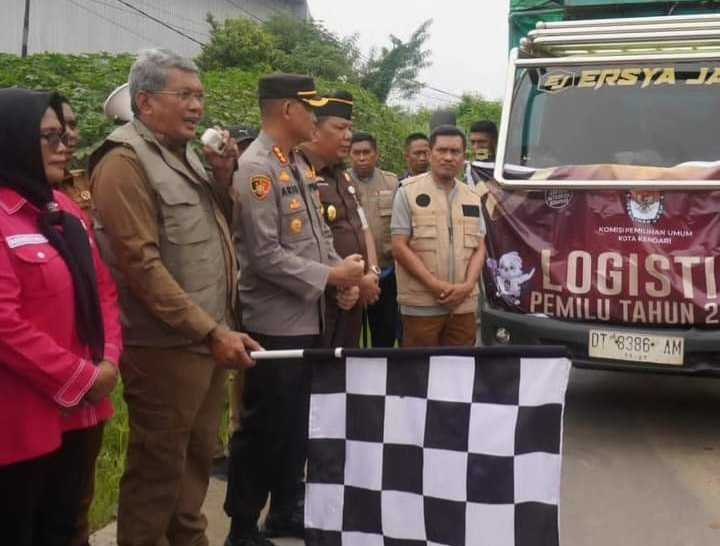 KENDARI – Penjabat (Pj) Wali Kota Kendari, Muhammad Yusup didampingi Forkopimda Kota Kendari melepas pendistribusian logistik pemilu tahun 2024 di gudang logistik KPU Kota Kendari, pada Selasa (13/2/2024).
