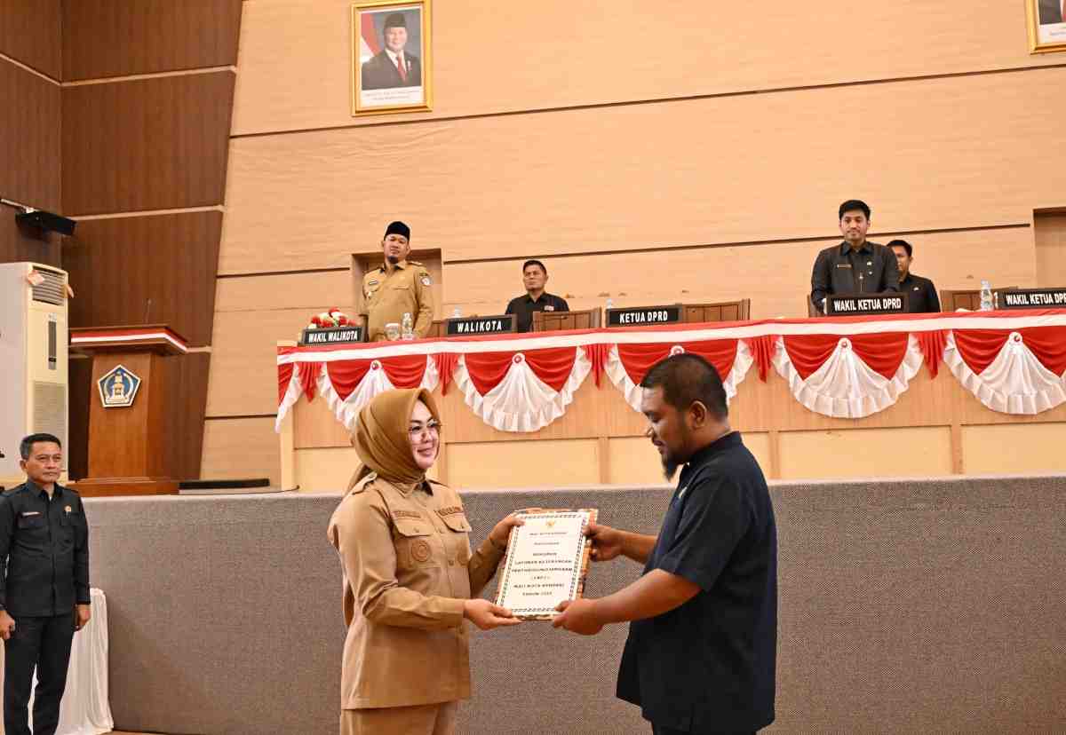 Wali Kota Kendari, Siska Karina Imran saat menyerahkan dokumen LKPJ tahun 2025 kepada Ketua DPRD Kota Kendari, La Ode Muhammad Inarto pada Senin (30/3/2026)