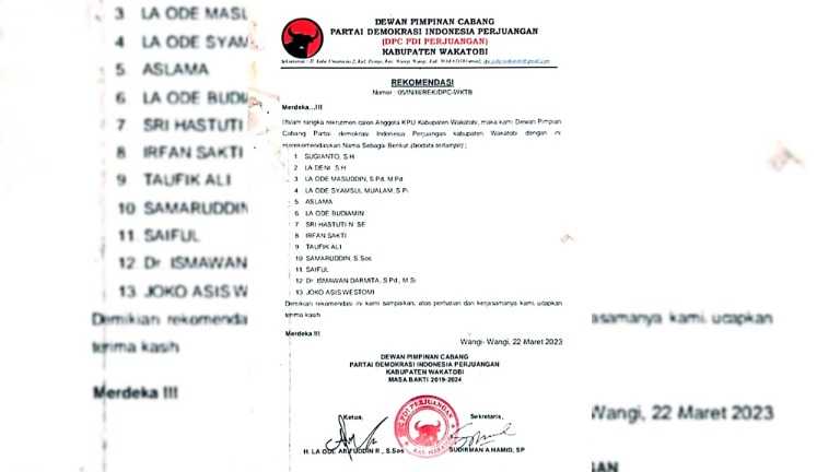Indikasi tersebut muncul, berdasarkan surat rekomendasi yang beredar tercantum dikeluarkan oleh DPC PDIP Kabupaten Wakatobi dengan nomor 05/IN/lll/REK/DPC/WKTB tertanggal 22 Maret 2023 yang merekomendasi 13 nama anggota PPK aktif yang mengikuti seleksi KPU kabupaten/kota.