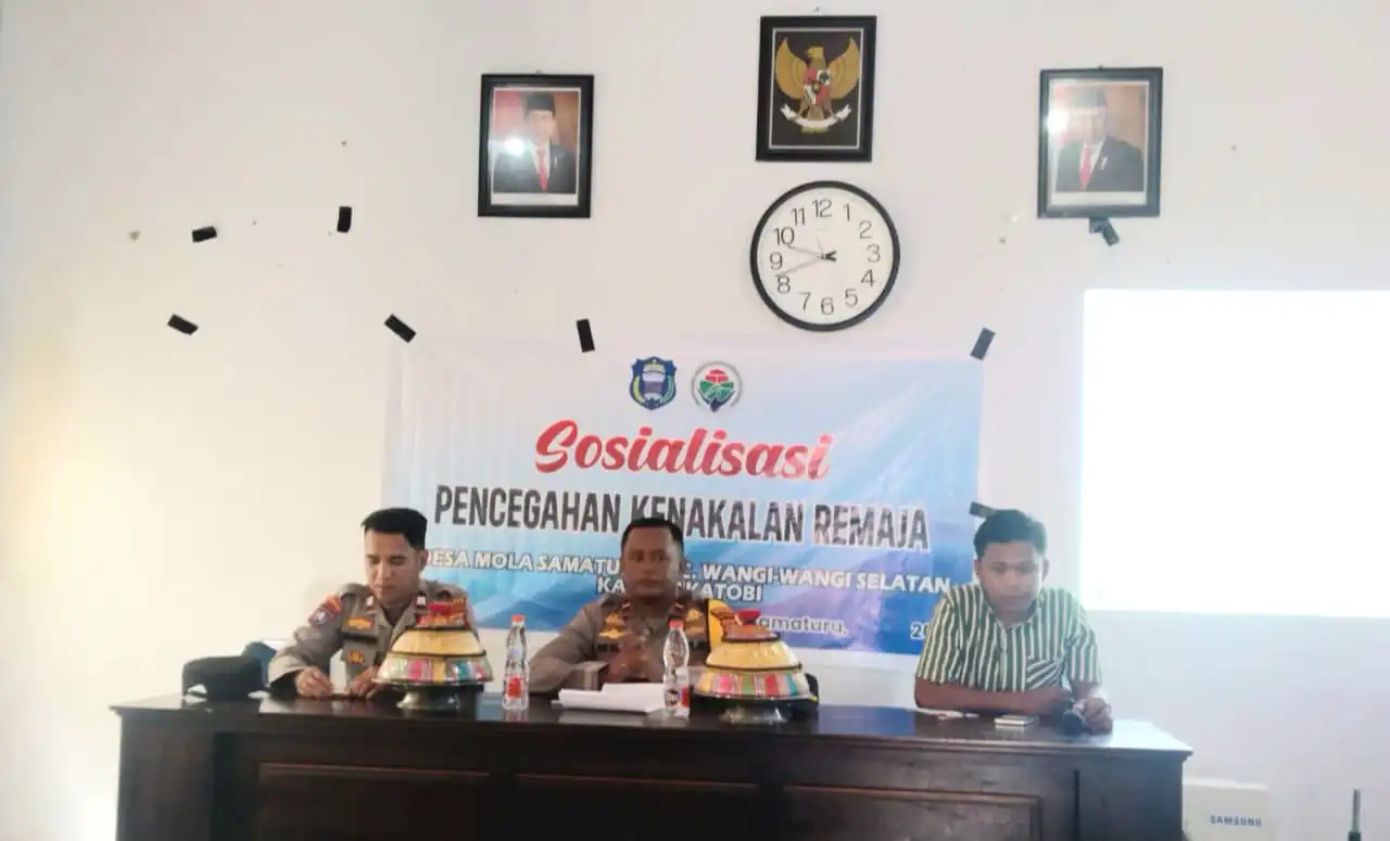 WAKATOBI – Polsek Wangi-wangi Selatan (Wangsel) menggelar Sosialisasi Pencegahan Kenakalan Remaja di ruang serba guna Desa Mola Samaturu, Kecamatan Wangsel, Selasa (10/9/2024).