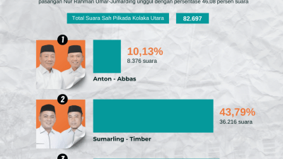 KOLAKA UTARA – Pasangan calon Bupati dan Wakil Bupati Kabupaten Kolaka Utara (Kolut) nomor urut 3, Nur Rahman Umar-Jumarding meraih…