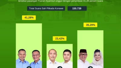 KONAWE – Pasangan calon Bupati dan Wakil Bupati nomor urut 1, Yusran Akbar-Syamsul Ibrahim unggul berdasarkan hasil rekapitulasi perolehan suara…