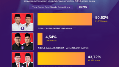 BUTON UTARA – Pasangan calon Bupati dan Wakil Bupati Kabupaten Buton Utara (Butur) nomor urut 1, Afirudin Mathara-Rahman unggul berdasarkan…