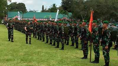 KONAWE SELATAN – Panglima Kodam (Pangdam) XIV/Hasanuddin, Mayjen TNI Totok Imam Santoso memimpin upacara penerimaan 450 personel Satuan Tugas (Satgas)…