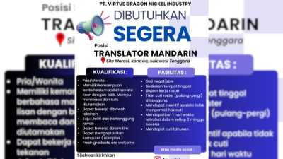 KONAWE – PT Virtue Dragon Nickel Industry (VDNI) Site Morosi, Kabuapten Konawe, Sulawesi Tenggara (Sultra) membuka lowongan kerja untuk posisi…